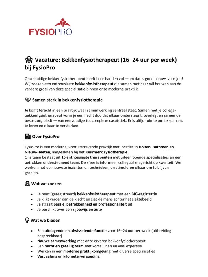 FysioPro staat voor Persoonlijk Resultaat gerichte Fysiotherapie in de Omgeving van Holten, Bathmen en Nieuw Heeten. Wij zijn een grote groepspraktijk met diverse specialisme en aandachtsgebieden. U kunt bij ons terecht voor Fysiotherapie, Manuele Therapie, Oncologie Fysiotherapie, Sportrevalidatie, Handtherapie, Bekkenfysiotherapie, Psychosomatiek, Orofaciale therapie, Geriatrie therapie en Echografie